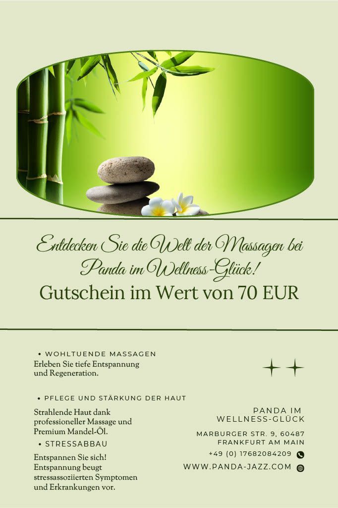ich biete zuerst Gutscheine in digitaler Form ausschließlich per Vorkasse sowie gedruckte Gutscheine (siehe unten) an. Was digitale Gutscheine anbelangt, so funktioniert das ganz einfach: Sie schreiben einfach eine Email an mich (Masseurin Paulina; Email: paulina@panda-jazz.com) und teilen mit, welchen Gutschein (siehe die Nummer jedes Gutscheines unten) und in welchem Wert Sie gerne kaufen möchten. In der Regel innerhalb von 24 Std. kriegen Sie eine Rechnung von mir per Email mit der Bitte, den entsprechenden Betrag auf mein Konto zu überweisen. Erst nach erfolgreichem Zahlungseingang wird Ihnen der gewünschte Gutschein mit einem Gutscheincode per Email zugesandt. Möchten Sie den Gutscheincode weiterversenden, sollten Sie selbst die von mir erhaltene Email bzw. den Gutscheincode weiterleiten.